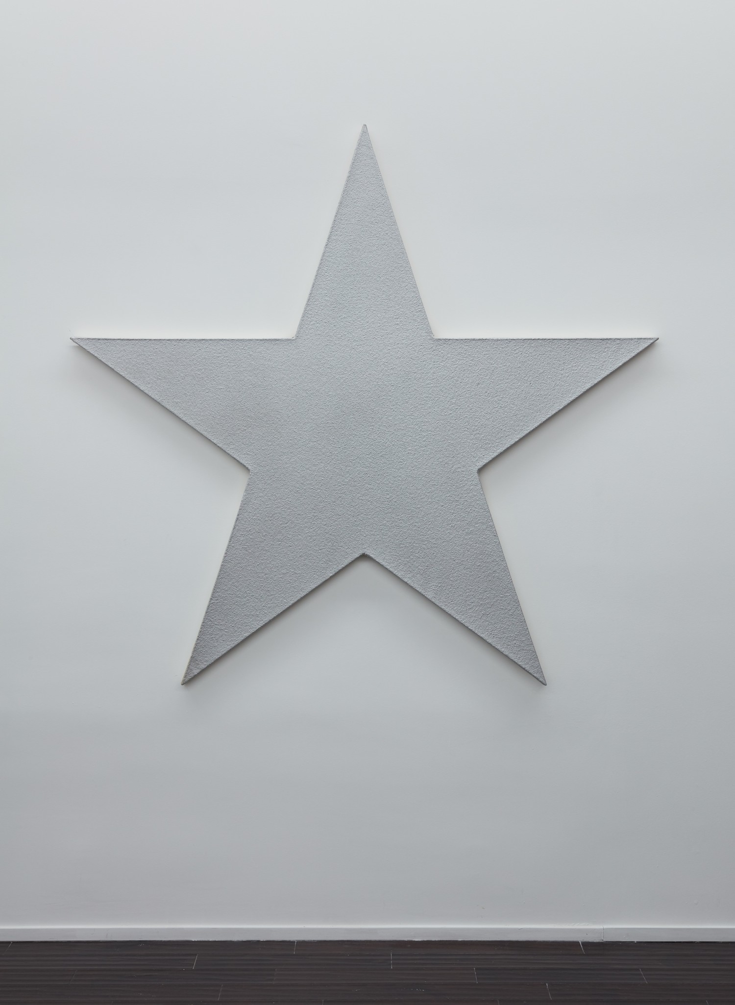 Olivier Mosset, features three works from 2008. Three star-shaped canvas works are covered with a polyurethane spray used to coat and protect pickup truck beds for endurability. Three stars—gold, silver and copper.