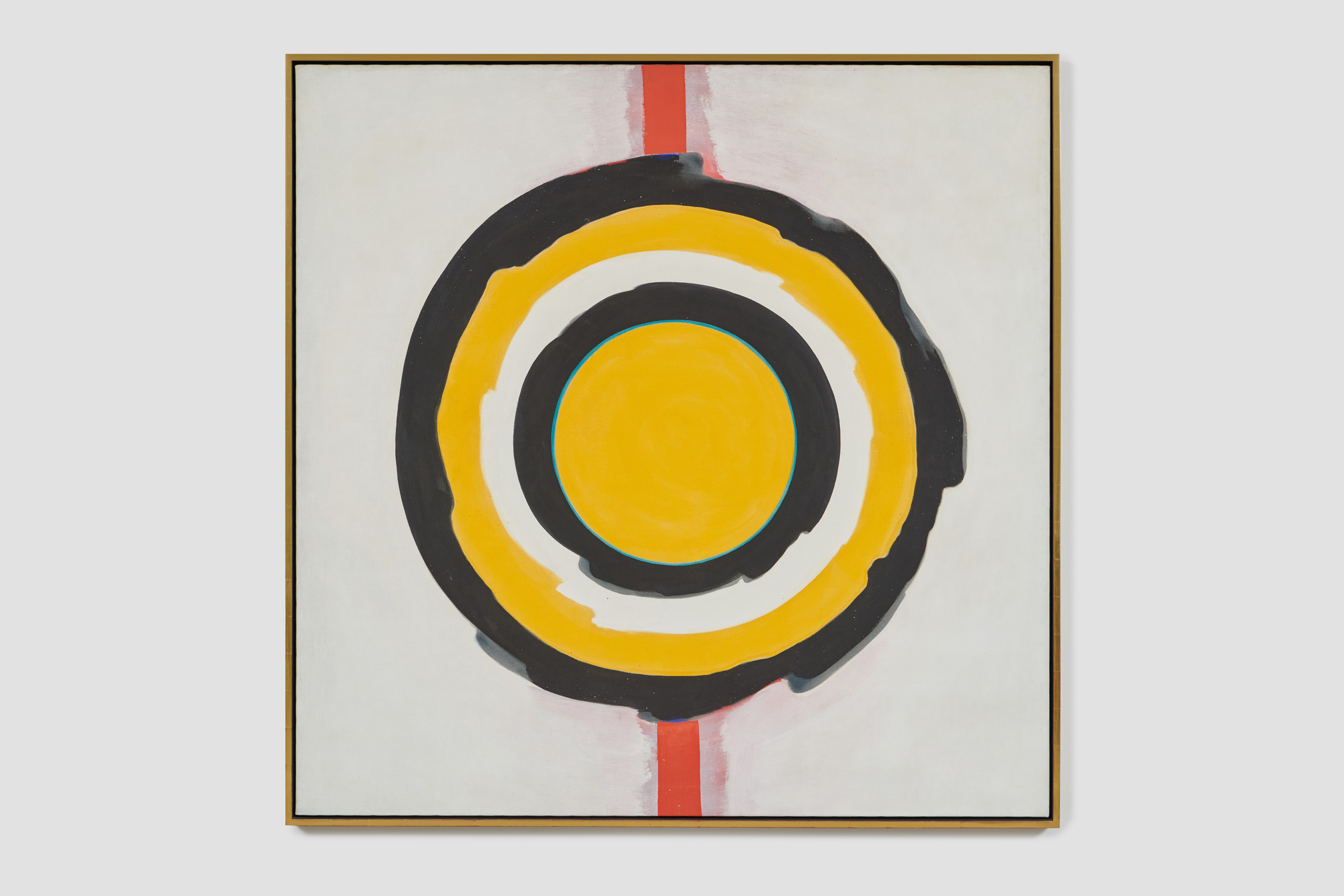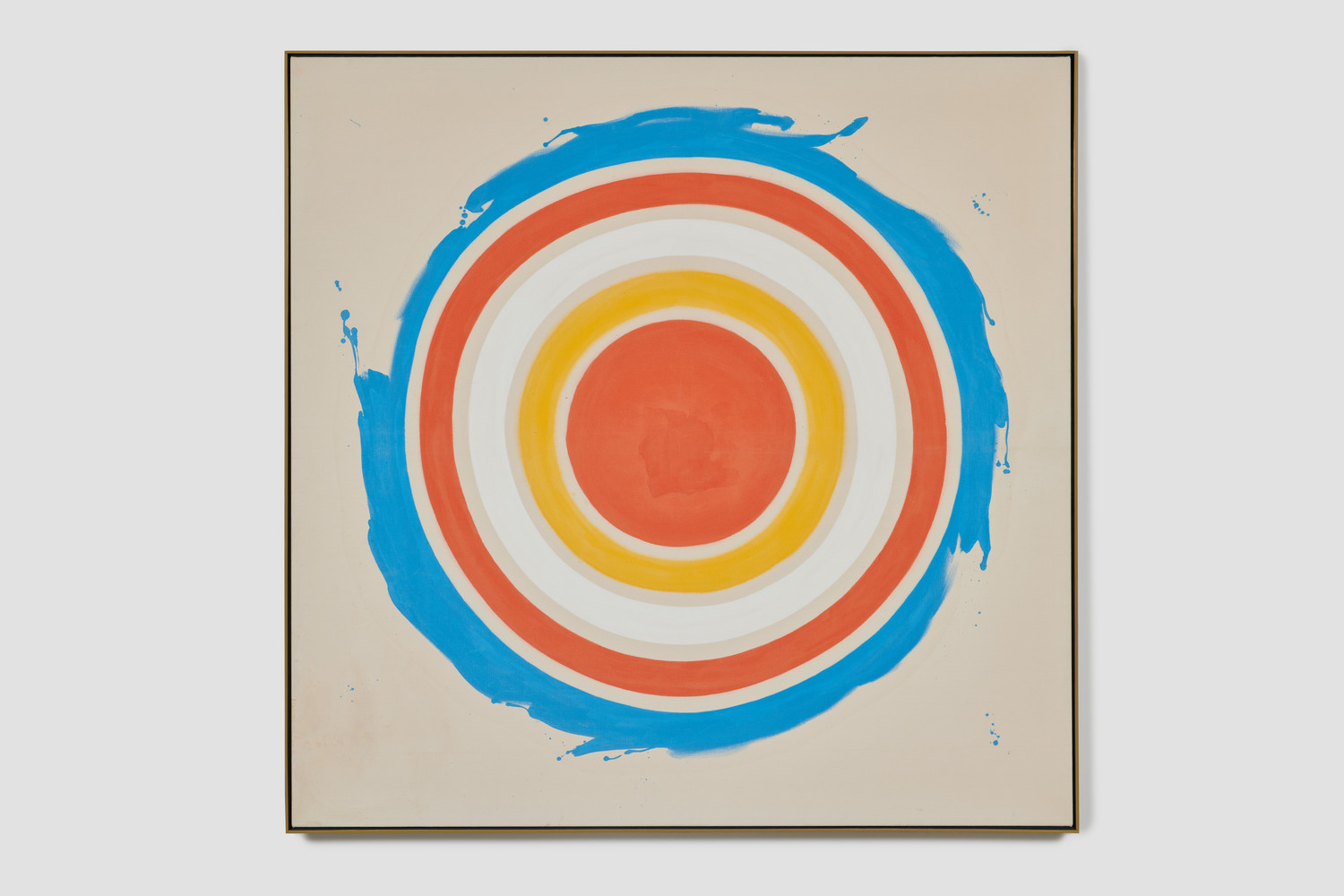In Noland’s Circle Paintings (starting 1956) the circle is not a figurative, geometric or optical, but a subject that stands as a single expressive entity. Noland subsumes Jackson Pollock’s method of appearing to work from the center out and working around the canvas. He subsumes Claude Monet’s open rippling strokes as impressions of light and water and Paul Cezanne’s use of color patches and enclosures. He subsumes Orphism and Synchromism of the 1910s, where circles of specific colors swirl together. Noland takes these references in art history and rounds them up in circles towards a practice of emphasis and liberation of colors.