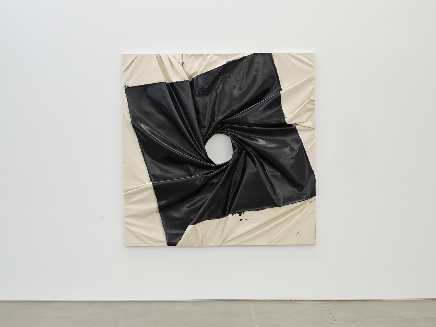 Steven Parrino also works with unprimed canvas intimately by actually physically shaping the canvas to preserve the proximity of material to content. Peel Out (2000) and Spin-Out Vortex (Black Hole) (2000) are visual metaphors of a “spin-out motion” from the traditional idiom of painting. The circular void in Spin-Out Vortex (Black Hole) and the placement of a metal object in the center of Peel Out are both tributes to Modernism and performative actions that lend additional dynamism and disruption to then-celebrated formalist and historical traditions of flatness of a canvas.